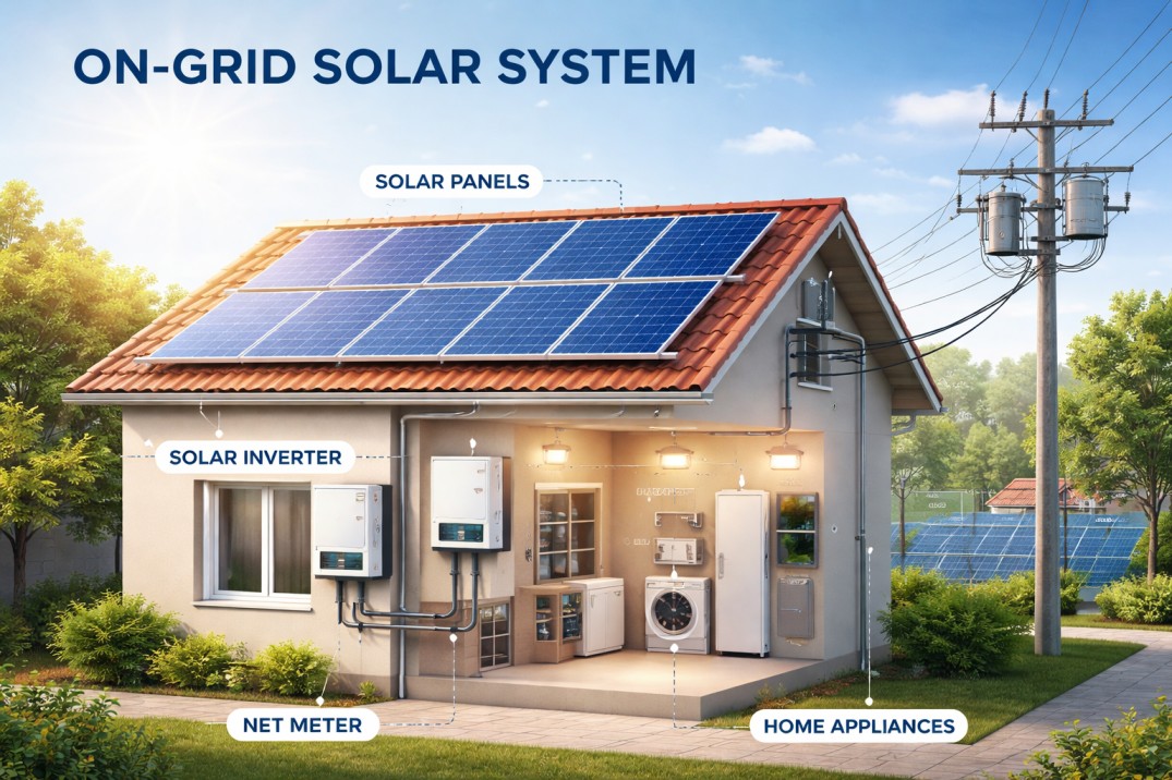 On-Grid Solar Systems An On-Grid Solar System is a solar power solution that is connected directly to the electricity grid. It allows users to generate solar power during the day, consume it in real-time, export surplus energy to the grid, and draw power from the grid when solar generation is not available. Unlike off-grid systems, on-grid systems do not use batteries, making them more affordable and low maintenance. How an On-Grid Solar System Works Solar panels generate DC electricity from sunlight. The on-grid inverter converts DC power into AC power usable by appliances. Solar power is first consumed within the premises. Excess electricity is exported to the grid through a net meter. During night or low sunlight, power is automatically drawn from the grid. Key Components Solar PV Modules On-Grid Inverter Net Meter AC & DC Distribution Boards Mounting Structure Earthing & Lightning Protection Benefits of On-Grid Solar Save up to 90% on electricity bills No battery required — lower system cost Eligible for government subsidy (residential) Low maintenance and long system life Environment friendly Limitations System shuts down during grid power failure Not suitable for locations with frequent power cuts Why Choose Green Energy Solutions Trusted solar EPC since 2018 5000+ installations across Maharashtra Complete service including design, installation, net-metering, subsidy & AMC Dedicated local support team